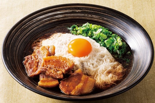 そばの力強い風味に負けないよう醤油の味わいをしっかり利かせたそばつゆです。三、食べ応えのある煮豚