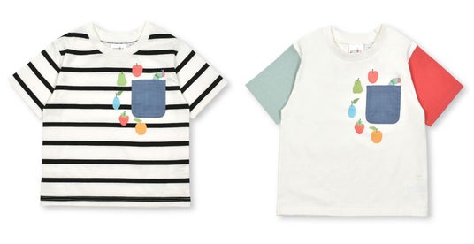 胸ポケットからあおむしがひょっこりと顔を出してこっちをみています。ポケットの周りにはフルーツがだくさん♪遊び心たっぷりのパッピーなTシャツです。 ボーダーor袖配色Tシャツ¥2,750(税込)