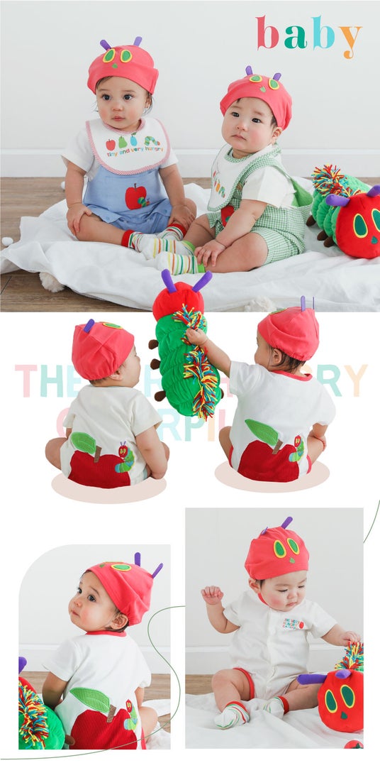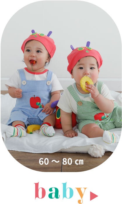 思わず笑顔が溢れる♪はらぺこあおむしになりきれる柔らかい帽子と、オシャレなオーバーオール風ロンパースのかわいすぎる2点セット。記念撮影にもおすすめです。 帽子&オーバーオール¥4,290(税込)