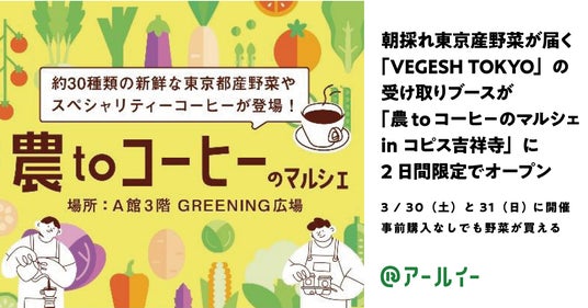 いまあるモノをReborn(再生)/ Reuse(再利用)/ Remake(修正)することで新しい価値を創造し社会貢献の実現を目指す「アールイー株式会社」(以下、アールイー、所在地:東京都北区、代表:今井直樹)は、3月30日(土)と31日(日)に、コピス吉祥寺(所在地:東京都武蔵野市)とともに「農toコーヒ-のマルシェ in コピス吉祥寺」を開催します。マルシェでは、弊社が開発した送料無料の店舗受取型ECサービス「VEGESH TOKYO」の商品受取ブースを開設し、事前にオンラインで購入した朝採れの野菜や果物を送料無量で受け取れるほか、同サービスが取り扱う野菜や果物の販売も行います。新鮮な東京産の野菜や果物の豊かな香りとみずみずしさを、ぜひ会場で体験してください。