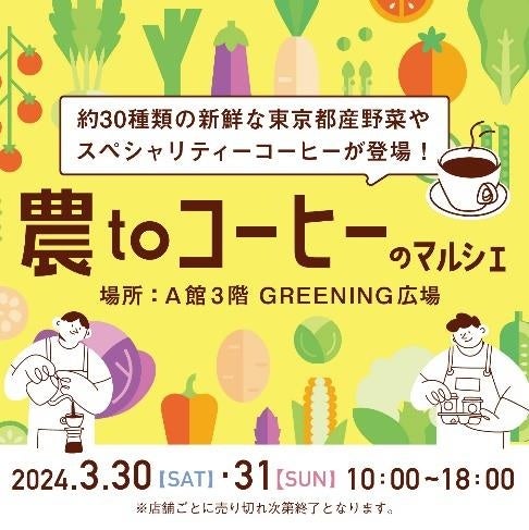 東京産の野菜や果物を送料無料で既存店舗で受け取れるECサービス「VEGESH TOKYO」を開発したアールイーは、「GREENINGしよう。」(GREENING=生命力と新鮮さを回復させて、自然な状態の自分にもどすこと)というコンセプトを掲げる「コピス吉祥寺」とコラボレーションしたマルシェイベント「農toコーヒ-のマルシェ in コピス吉祥寺」を、3月30日(土)と31日(日)の2日間にわたって開催します。
