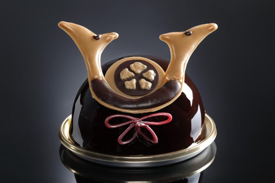 ほろ苦いキャラメルとチョコレートにバナナを合わせた濃厚な味わいのムースケーキ。大黒頭巾形で歯朶の葉の前立を添えている徳川家康の兜を表現しました。