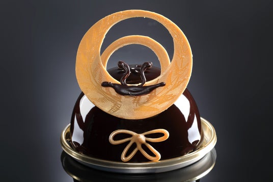 マンゴー、パッションフルーツ、チョコレートで仕上げたエキゾチックでさわやかな甘さのムースケーキ。豊臣秀吉の兜「一の谷馬蘭後立付兜」を表現しました。