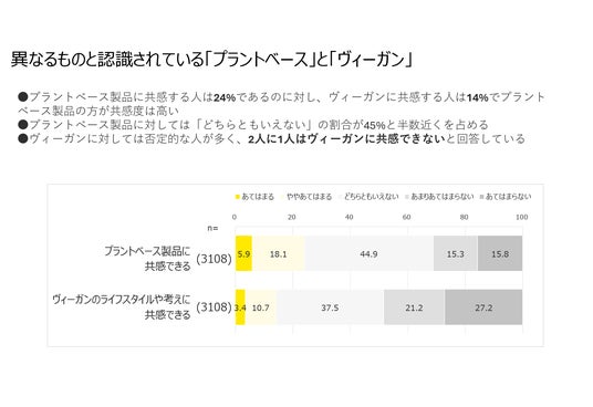 ヴィーガンとプラントベースが異なるものと認知されており、プラントベース製品の方が共感度が高いことが伺えます。