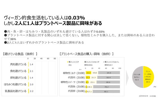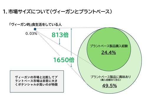 調査結果より、日本のヴィーガン的食生活をしているのは0.03%に対して、プラントベース製品の購入経験者は24.4%、プラントベース製品に興味ありと回答した方は49.5%となりヴィーガン市場と比較してプラントベースベース市場は非常に大きくポテンシャルがあるのが特徴です。