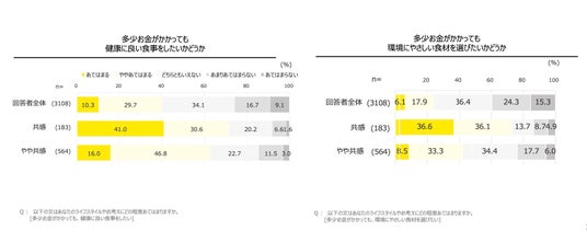 レポートでは、プラントベースに「共感する」層を属性、特性、購買理由や行動別に記しています。例えば彼らは「多少お金がかかかっても環境や健康によいものを好み、製品の原料等を気にする」傾向があります。