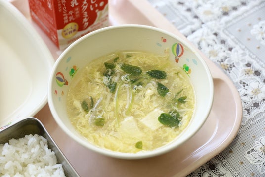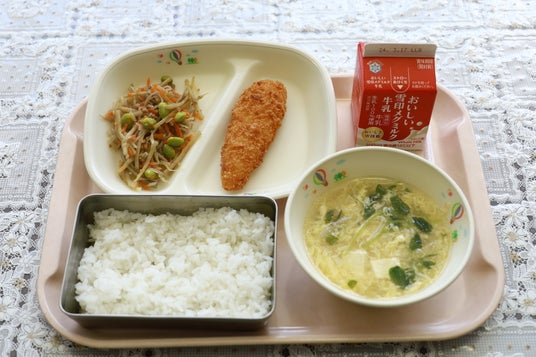 大郷町では、子どもたちに地元の食材を食べてもらおうと、米や野菜などの大郷町産食材を毎日給食に使用しています。この日の給食では、スープに使用された豆苗、ごはん、五目きんぴらの枝豆が大郷町産の食材でした。