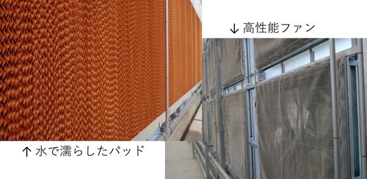 パッド&ファン冷房ハウス側面の片方に水で濡らしたパッドを設置し、反対の側面の大型換気扇で排気・通風を行う、気化熱を利用したエコな冷房システム。72台の高性能ファンを設置しています。