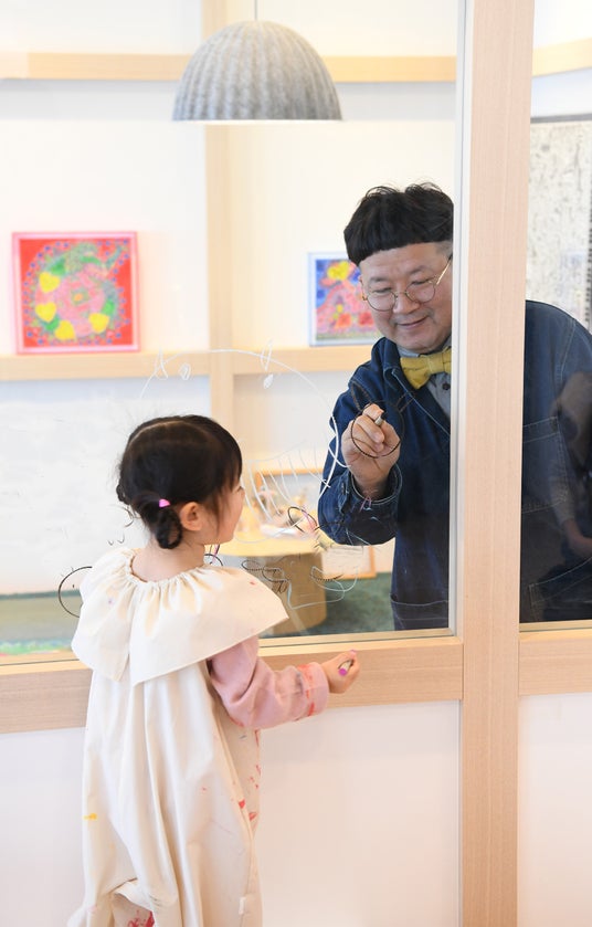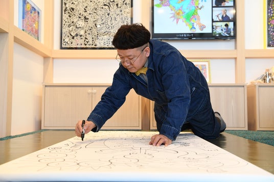 アトリエで絵を描くたいぞうさん 僕にとってアートとは、自分の気持ちを表現できる分野です。今はスマートフォンさえあれば、簡単に情報を知ることができるし、物もすぐに手に入れることができる時代。子どもたちには、アートを通じて作る過程を楽しんでほしいです。アートを取り入れることによってモノを作る楽しさを学んでほしいです。