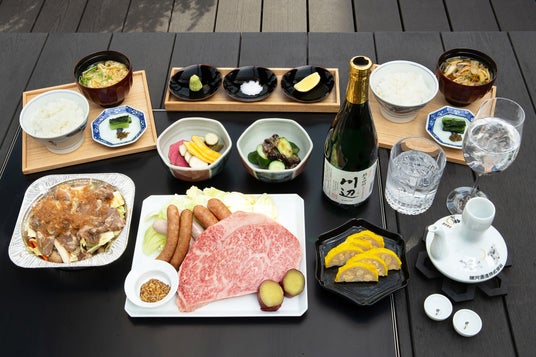 【内 容】球磨焼酎「川辺」(四合瓶720ml)、くまもと黒毛和牛リブロース、信州味噌ちゃんちゃん焼き、辛子蓮根、白米、味噌汁 など