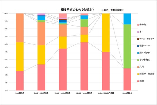贈る予定のものを金額別に割合をみると、5,000~10,000円未満、10,000~30,000円未満の予算では、現金を選ぶ比率が高く、50,000円以上の予算では、ランドセルを選ぶ比率が他より圧倒的に高かった。