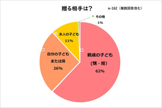 入学祝いを贈る相手には、親戚の子(甥・姪)、 自分の子や孫 といった回答が8割以上を占め、近い親族や身内間で贈り合うものという認識が一般的なようです。友人の子どもへ贈るという回答が11%で、「思いがけず友人からお祝いをいただき、相手の気持ちがとても嬉しかった。」と贈り物に込められた想いを感じ、嬉しいサプライズとなった声もありました。