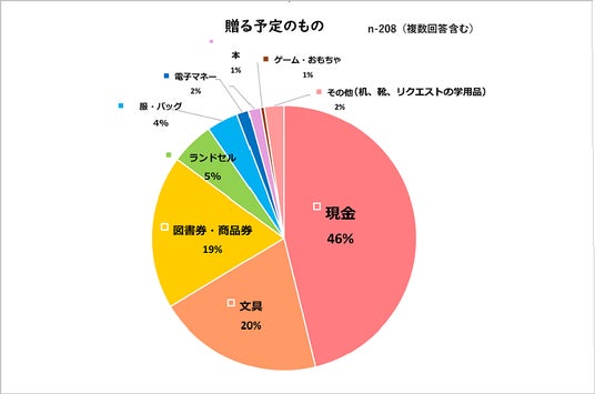 入学祝いに贈る物として、2位 文具、3位 図書券・商品券を抜き、1位 現金との回答が多く、全体の46%という結果だった。
