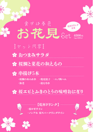 全長約4kmにわたり約800本のソメイヨシノが咲き誇る全国一位の人気お花見スポット、目黒川沿いの桜並木。昼は春風に吹かれる中で壮大な光景を楽しみ、夜には夜桜が美しくライトアップされピンクのぼんぼりが点灯することで目の前には幻想的な光景が広がる、春のうららの目黒川。この度、全国各地から大勢の花見客で賑わうお花見の名所のすぐ近くにある“串揚げとおでん「串 ポロ衛門 中目黒」”では3月20日よりお花見シーズン限定で「お花見セット」を提供開始いたします。