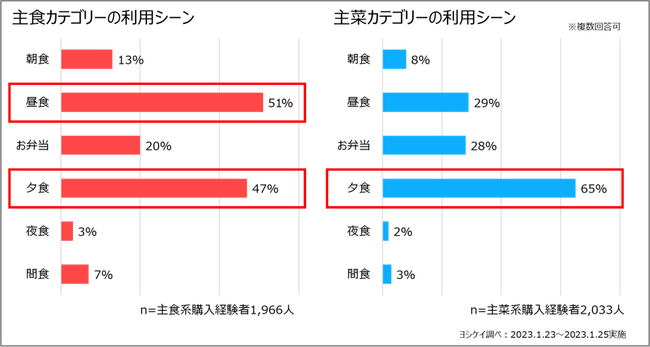 2020年コロナ禍においては主食カテゴリーが伸長。学校休校や在宅勤務等、自宅で昼食を食べる機会が増え、簡単に調理できる冷凍の米飯・丼の具・ピザといった主食カテゴリーの需要が高まりました。2023年コロナ5類移行でも継続して主食カテゴリーが首位を占めており、 主食系は主菜系(おかず系)よりも利用しやすいシーンが多い点も人気の理由と考えられます。コロナ禍を契機として、冷凍食品の利便性を認知し日常的に使用する層が増えたと思われます。(ヨシケイ実績より)