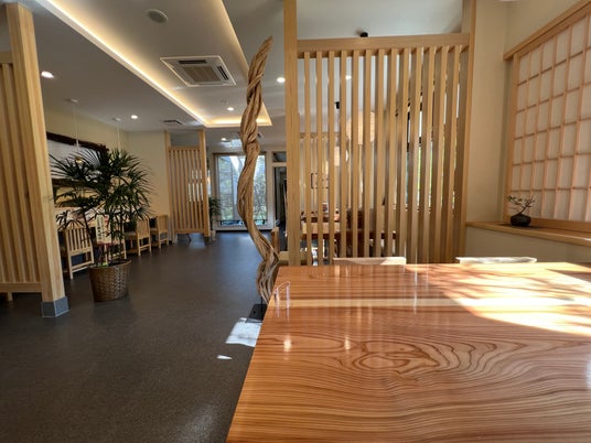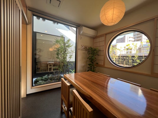 店内は和の雰囲気を愉しんで頂きたいと、白木を基調とした落ち着いた雰囲気にしております。全席テーブル席で十分な間隔をとったゆったりとしたつくり。バリアフリーなので車いすのお客様もそのままお席について頂けます。靴を脱ぐ必要もありません。
