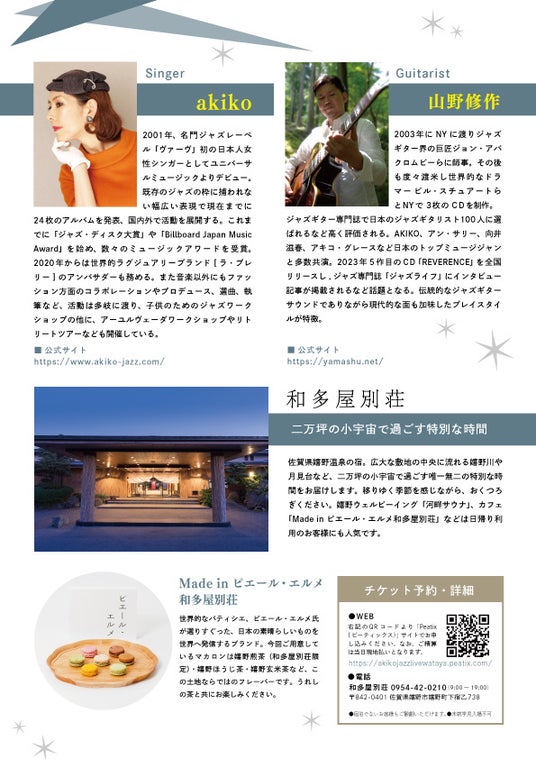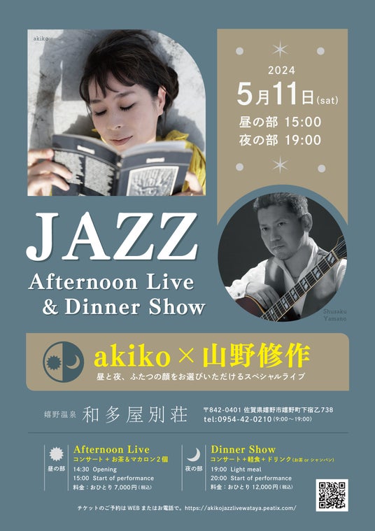 名門ジャズレーベル「ヴァーヴ」初の日本人女性シンガーとしてユニバーサルミュージックよりデビュー、日本を代表するジャズシンガー「akiko」と、ジャズギター専門誌で日本のジャズギタリスト100人に選ばれるなど、世界で高く評価される山野修作。おふたりが嬉野温泉の美しい景色をバックに心温まるジャズの調べを奏でます。この特別なライブは昼の部と夜の部があり、それぞれ異なる魅力を持っています。宿泊や日帰り温泉と組み合わせてのご参加もおすすめです。皆さまのご来場を心よりお待ちしております。●昼の部「Afternoon Live」