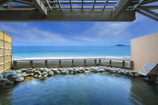 目の前に海しかない絶好のロケーションを楽しむことができ、オーシャン・フロントの客室はもちろん、温泉大浴場、貸切露天風呂、房総・鴨川の味覚を存分に味わえるレストラン「THE GUNJO RESTAURANT」など、館内のいたるところから海の恵みを堪能いただけます。