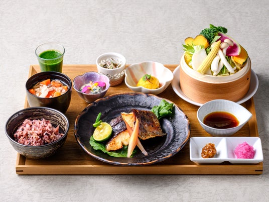 メインは国産白味噌で熟成させた「西京味噌焼き」など、主菜と小鉢3種、十六穀米のご飯、豚汁が付き、さらに土鍋を使ってお席で炊き上げる「土鍋おぼろ豆ふ」か、素材の旨味を活かした「野菜せいろ蒸し」のどちらかをお選びいただけます。