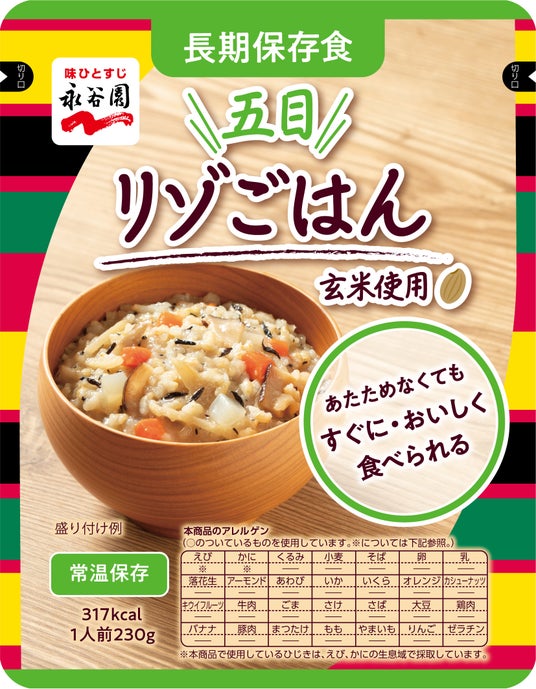 永谷園の最初の長期保存食は2017年4月に発売した「フリーズドライごはん」です。フリーズドライ製法を用いることで、「お湯で3分、水で5分、そのままでも食べることができる」商品です。ドライ商品なので、非常に軽量な商品です。両品とも災害時だけではなく、アウトドアなどの行動食としてもご利用いただけます。