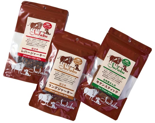 レバージャーキー・ラングジャーキー・牛タンスティックの3種詰め合わせ。