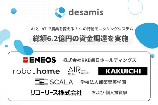デザミス株式会社(本社:東京都江東区、代表取締役 兼 CEO:清家浩二)は、ENEOSイノベーションパートナーズ合同会社、株式会社RKB毎日ホールディングス、株式会社Robot Home、株式会社梓総合研究所、株式会社カクイチ、株式会社スカラ、学校法人都築育英学園、リコーリース株式会社(アルファベット順・五十音順)、および個人投資家から総額6.2億円の第三者割当増資を実施いたします。
