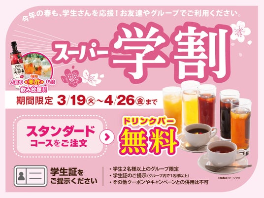 【スーパー学割キャンペーン概要】スタンダードコースのご注文で、通常299円(税込329円)のドリンクバーが『無料!!』=== ご利用条件 ===
