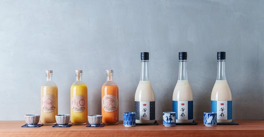 季節酒「たすき」シリーズ(左から3アイテム)、定番酒「芳扇」シリーズ(右から3アイテム)