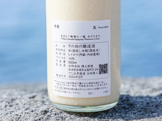 令和五年三月に店舗開業一周年の節目を迎えるにあたり、当店の一周年記念酒を兼ねた復興支援酒として、「芳扇 友 Peace label」を限定発売することといたしました。1本あたり500円を被災した酒蔵様の再建のための義援金として「芳扇堂 友の会」に充当し、寄付します。長崎市内では唯一となる伝統的酒造り技法に基づく醸造元として、平和の街ながさき出島から一刻も早い復興と穏やかな日常への祈りを込めて、微力ながら復興のご支援とさせていただきます。
