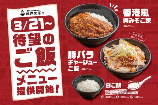 食の感動体験を提供する、株式会社トリドールホールディングス(東京都渋谷区、代表取締役社長兼CEO粟田貴也、以下、トリドールHD)の傘下グループ企業である「株式会社譚仔日本」は、2024年3月21日(木)より、ご飯メニューとして、『香港風肉みそご飯』と『豚バラチャーシューご飯』、『白ご飯』の3商品の提供を開始いたします。