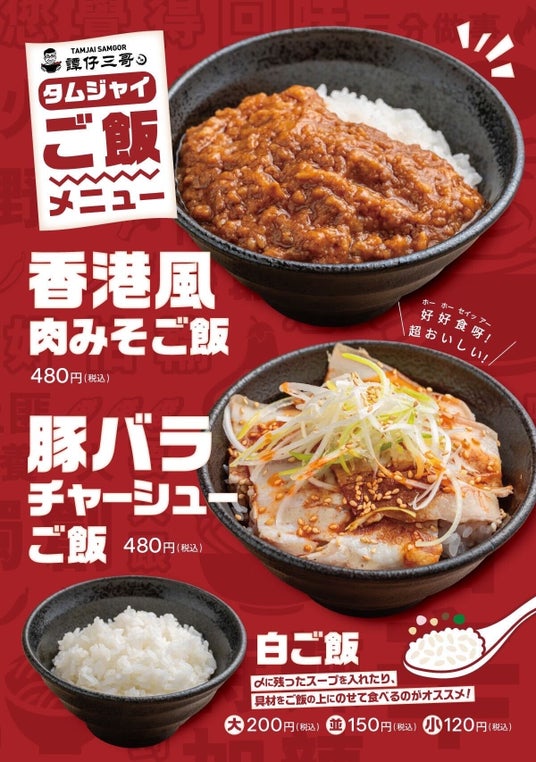 この度、お客様からご要望をいただくことも多かった待望の“ご飯メニュー”として、人気の具材をのせたミニ丼と、白ご飯の提供を開始します。スープの味変としても注文される方の多い、旨みがぎゅっと詰まった「肉みそ」をご飯にたっぷりとのせた『香港風肉みそご飯』、トッピングとしてベスト3に入る人気の「豚バラ」に、長ネギ、ニンジン、ゴマをのせ、醤油ベースのタレで味付けした食欲そそる『豚バラチャーシューご飯』、そして、スープをかけたり、味の染み込んだ具材をのせたりしてお楽しみいただける『白ご飯』の3種をご用意しました。『白ご飯』は、大・並・小の3つのサイズからお選びいただけます。