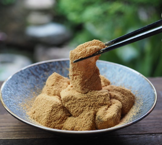 別名「京風きなこ」ともいわれる国産大豆100%深煎りの「黒須きな粉」を贅沢に使用しています。一般的なきな粉よりも焙煎温度が高く、焙煎時間も長いため、色や味が濃く、きな粉本来の風味がより際立っている逸品です。とろ~りとした口当たりながらさわやかな風味のわらび餅との相性は抜群です。ぜひご堪能下さい。