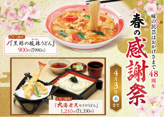 株式会社サガミホールディングスのグループ企業である味の民芸フードサービス株式会社(本社:東京都立川市錦町3-6-6 代表取締役社長 榊原 晃)は、手延べうどんを中心とした和食麺処『味の民芸』の50店舗において、『春の感謝祭』を2024年3月21日(木)より4月3日(水)までの14日間、開催いたします。