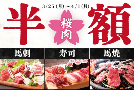 なお、熊本下通り店では、開店を記念して3月25日(月)から4月1日(月)までの間、名物である「馬刺し」「馬肉寿司」「馬焼き」が日替わりで半額になるキャンペーンを実施します(詳細は後述)。