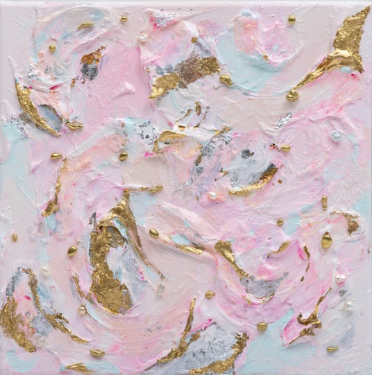 “桜舞/Aube” no.2022417 (2022) 250 x 250 mm Acrylic, pearls, brass, gold and silver leaf and crystals on canvas