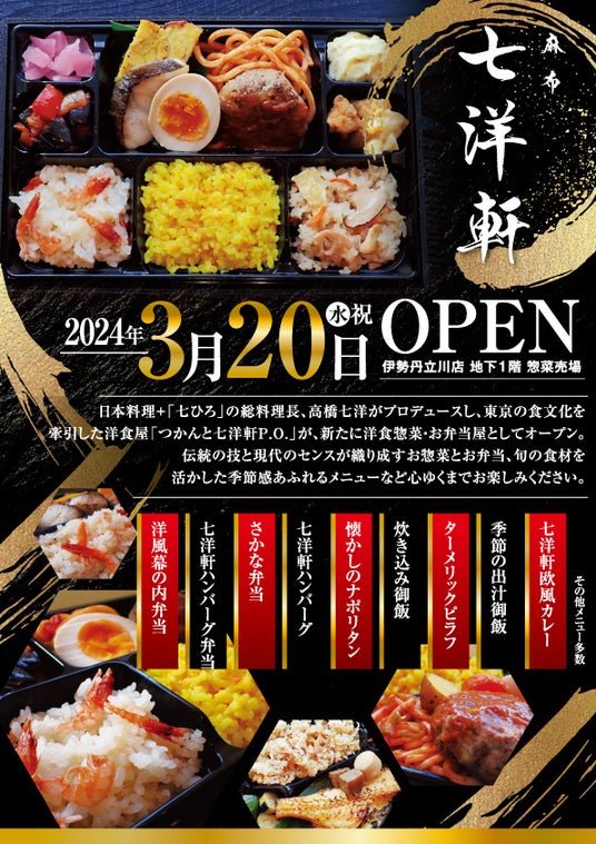 東京、立川市 - 西麻布で高い評価を受ける「七ひろ」の総料理長、高橋七洋が新たな食文化の波を伊勢丹立川店にもたらします。「麻布七洋軒」は、2024年3月20日にオープンし、日本料理をベースにした新感覚の洋食惣菜・お弁当を提供します。