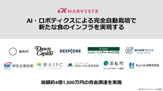イチゴ自動栽培ソリューションを開発するHarvestX株式会社(本社:東京都文京区、代表取締役社長:市川友貴)は、プレシリーズA で総額約4億1,000万円の資金調達を実施いたしました。既存株主である「ANRI4号投資事業有限責任組合」、「DEEPCORE TOKYO 2号投資事業有限責任組合」、「オープンイノベーション推進1号投資事業有限責任組合」に加え、新たに「Dawn Capital 1号投資事業有限責任組合」、「SMBCベンチャーキャピタル産学連携3号投資事業有限責任組合」、「食の未来1号投資事業有限責任組合」と、「新生ベンチャーパートナーズ2号投資事業有限責任組合」、「しんきん-やらまいか投資事業有限責任組合」、「ヒューリックスタートアップ1号投資事業有限責任組合」を引受先としています。さらに、交付金※1の交付を受けております。これにより、合計資金調達額は6億1,000万円となりました。