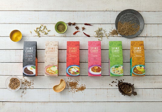 スパイスへのこだわりはパッケージにも。スパイスのアイコンを全面にあしらい、それぞれのフレーバーに使われているスパイス名を表記。フレーバーのイメージに合わせたカラフルな色目とカレーのイラストが目を引くパッケージは、贈り物にもおすすめです。