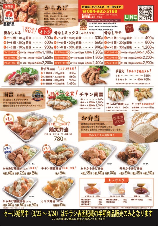 鶏笑 駅家店のオープンを記念して、2024年3月22日(金)から3月24日(日)までの3日間、駅家店限定で「ムネからあげ」「ムネからあげ弁当」の半額フェアーを実施致します。大変な混雑が予想されますので、モバイルオーダー、電話等で事前のご予約をお願い致します。