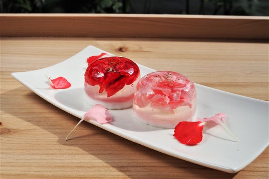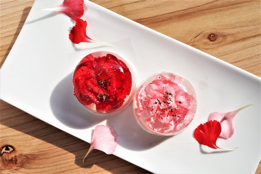 専用カップに錦玉羹(寒天に砂糖を入れて固めたもの)を流し、カーネーションを花が咲くように一輪ずつ丁寧に広げました。真っ白な浮島生地を土台にしてカーネーションが浮き目立つように工夫をしました。仕上げに金箔を散らし、母の日にふさわしい高級感のあるエレガントな和菓子に仕上げました。カーネーションの花はほのかなバラの香りがする、上品な味わいになっています。