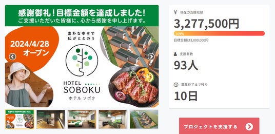 株式会社アド・クリーク(本社:新潟県糸魚川市、代表取締役:歌川多喜司)は、新潟県妙高市「道の駅あらい」隣接地に全棟コテージタイプの「HOTEL SOBOKU(ホテル ソボク)」を2024年4月28日開業予定。クラウドファンディングCAMPFIREにて先行予約ができる早割チケットを発売し、目標金額の300万円を達成しました。なお、本クラウドファンディングは3月31日まで実施いたします。