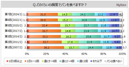 マイボイスコム株式会社(東京都千代田区、代表取締役社長:高井和久)は、7回目となる『パン』に関するインターネット調査を2024年2月1日~5日に実施しました。