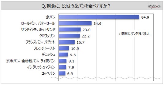 朝食に食べるパンは(複数回答)、「食パン」が朝食にパンを食べる人の84.9%となっています。「ロールパン、バターロール」が34.6%、「サンドイッチ、ホットサンド」「クロワッサン」が各2割強、「フランスパン、バゲット」が16.7%です。
