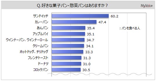「サンドイッチ」が60.2%にのぼります。続く「カレーパン」は47.4%、男性で比率が高くなっています。
