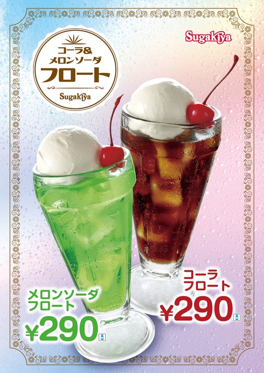 メロンソーダ、コーラに真っ赤なチェリーと、スガキヤオリジナルのソフトクリームをトッピングした、しゅわっと優しく弾けるドリンクをお楽しみください。