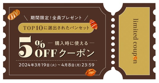 今なら期間限定で、推しパン選手権TOP10に選出されたパンセットの購入時に使える【5%OFF】クーポンをプレゼント中です。