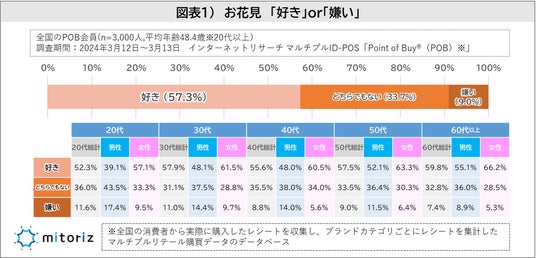 「お花見が好きか嫌いか」を調査したところ、全体では「好き(57.3%)」で約6割の人が“お花見が好き”と回答しました。世代・男女別で見た場合、20代の男性のみ「好き」が4割を下回りましたが、「嫌い」は最も多い20代でも1割ほどで、40代以上は1割を下回ります。どの世代も女性の方が好きの比率が高く、男女とも世代が上がるに連れ比率が高い傾向があります(図表1)。