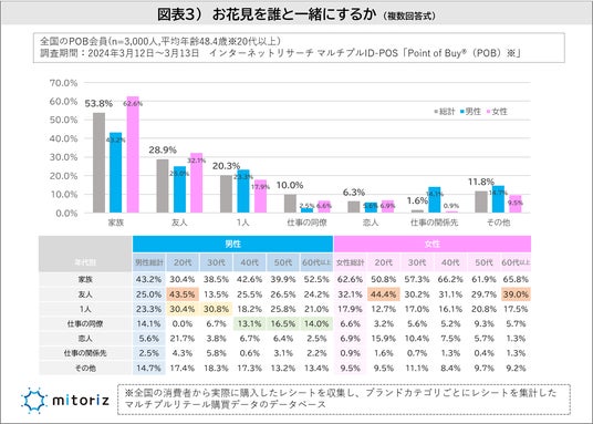 一緒にお花見をする人は「家族」が最多となる一方で、20代・30代の男性は1人花見も多い!?