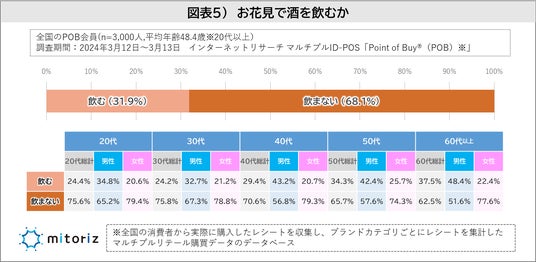 お花見でお酒を飲む人は3割程度、全世代とも男性の比率が高く、世代が上がると数値も上昇