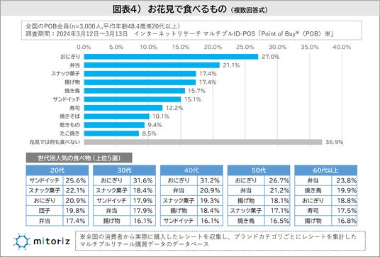 食べ物は「おにぎり」が全世代で定番も、20代は「サンドイッチ」がトップ!株式会社mitoriz(本社:東京都港区、代表取締役社長:木名瀬博)は、消費者購買行動データサービス「Point of Buy(R)(以下、POB)」の会員3,000人に「お花見と飲食に関する調査」を実施致しました。